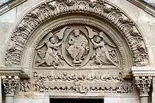 Романське мистецтво тривало у період між бл. 1000 роком до початку готики у 12-му ст., та було пов'язано зі зростанням монашества у Західній Європі. Стиль початково зародився у Франції, але поширився на християнську Іспанію, Англію, Фландрію, Німеччину, Італію та інші території, ставши першим середньовічним стилем, який поширився всією Європою, хоча і з регіональними відмінностями[31]. Зародження стилю збіглося зі значним зростанням будівництва церков та збільшенням розміру соборів і основних церков; багато з них у наступні періоди були перебудовані, але часто у романський період мали майже той самий розмір, що і сьогодні. В романській архітектурі домінували товсті стіни, масивні структури, що сприймались як єдина органічна форма, склепінчасті дахи та закруглені вікна та арки.