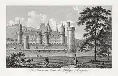 Філіп II був охоплений пристрастю до будівництва, за нього були вибруковані головні паризькі вулиці і площі, які раніше перебували в жахливому стані, побудовані фортеця Лувр, нові фортечні мури і великий продовольчий ринок Шампо. Фортечні мури, зведені коштом корони і міста, визначили нові межі Парижа і ніби символізували захист мешканців міста королем, який був у хрестовому поході. У 1190—1200 роках мури висотою 2 метри обгородили тільки квартали правобережжя. Через два десятиліття вони охопили й лівий берег, але там досягли у висоту 8-9 метрів. Обидва ці півкола мали брами у напрямку Руана, Дре, Орлеана, Сана та інший великих міст. За чверть століття Париж перетворився на найбільш захищене місто королівства, і, крім того, мури слугували для парижан об'єднувальним фактором, зміцнюючи їх свідомість. У 1190—1202 роках біля муру побудували Луврський донжон, з основою 15 метрів у діаметрі, висотою 31 метр і стінами товщиною 4 метри, який оточували чотири вежі висотою 25 метрів кожна. Лувр став найважливішим елементом оборонної системи правобережжя, прикриваючи Париж з північного сходу (сюди ж перенесли арсенал, архіви і частину скарбниці)[29][3][10][23].
