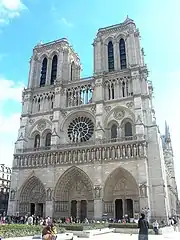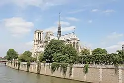 Блискучим зразком готичної архітектури є собор Паризької Богоматері (Нотр-Дам-де-Парі), що височіє у східній частині острова Сіте. Близько 550 року на місці античного храму Юпітера за наказом франкського короля Хільдеберта I була побудована базиліка Святого Етьєна, до якої примикали баптистерій, присвячений Івану Хрестителю, і церква Богоматері (тут же була резиденція єпископа Германа Паризького). У середині XII століття було вирішено їх перебудувати і фактично звести новий, більш місткий храм. Будівництво, розпочате з ініціативи паризького єпископа Моріса де Сюллі у 1163 році, велось довго і завершилось лише у 1343 році (саме тоді були створені капели між контрфорсами і вінець капел навколо хорів). Грандіозний на ті часи собор, здатний одночасно вмістити близько 10 тис. осіб (довжина — 130 м, ширина — 108 м, висота веж — 69 м, висота склепінь — 39 м), став своєрідним зразком середньовічного будівництва храмів у Франції. Навколо собору Нотр-Дам-де-Парі розташовувались монастир Богоматері, соборні школи і дома каноніков[56][14][57].