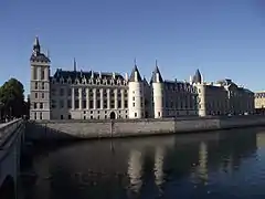 Західну частину острова Сіте займає величезний комплекс Палацу правосуддя. Його північний фасад, що виходить до правої притоки Сени, надає яскраве уявлення про суворий королівський замок з в'язницею і скарбницею, де зберігали казну. Три збережені вежі замку датуються XIII століттям, а кутова вежа була побудована століттям пізніше (на ній були встановленні дзвін, який сповіщав весь Париж про народження королівського спадкоємця, і перший в місті баштовий годинник). Після того, як у XIV столітті король Карл V переселився у просторіший Лувр, в старій резиденції монарха залишились парламент, рахункова палата та інші урядові органи. У 1417 столітті канцлер Франції був призначений на посаду консьєржа, тобто воротаря королівського житла, через що замок отримав назву замок Консьєржері. У XIX столітті будівля була істотно розширена, тоді ж був оформлений фасад, звернений до площі Дофіна[59][60][23].