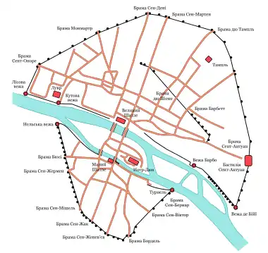 Як і всі феодальні міста Європи, Париж розвивався вельми стихійно. У міру необхідності його оточували фортечними мурами, які оберігали жителів міста і ближніх передмість від набігів бунтівливих феодалів та іноземних загарбників. Зведення оборонного кола почалося наприкінці XII століття і тривало понад 20 років. У будівництві була залучена величезна маса городян і селян. На початку XIII століття на обох берегах Сени були зведені два півкола кам'яних мурів, що доходили аж до води (їх загальна протяжність становила близько 5,3 км). Зубчасті мури сягали у товщину до 3 метрів біля основи, зверху проходив дозорний шлях, а через кожні 70-100 кроків здіймалися круглі фортечні вежі, яких налічувалося 67 (вони фланкували шість міських брам на правому березі і п'ять на лівому, що були споруджені на шляху найважливіших доріг, які зв'язували Париж з іншими містами). На правобережжі за муром залишилось поселення Сен-Мартен-де-Шан, а на лівобережжі — Сен-Марсель і Сен-Жермен-де-Пре, зате у міські межі потрапило абатство Святої Женев'єви, а також приміські поля, городи і виноградники (але невдовзі більшість з них зникла внаслідок активної забудови нових земель). У середині XIV століття на правому березі, де особливо швидко зростала торгово-ремісничі частина міста, півколо довелося розширити і в склад Парижу були включені низка передмість (на лівому березі влада обмежилася лише модернізацією старих мурів)[49][3][23].