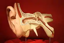 Сере́днє ву́хо (лат. auris media) — частина слухової системи ссавців (у тому числі людини). Складається з ряду сполучених між собою повітроносних порожнин: слухова труба (tuba auditiva), барабанна порожнина (cavum tympani), комірки соскоподібного відростка, у тому числі й найбільша з них — печера (antrum mastoideum), яка спеціальним проходом — входом у печеру (aditus ad antrum) з'єднана з барабанною порожниною. У барабанній порожнині знаходиться ланцюг слухових кісточок (молоточок, коваделко, стремінце), м'яз-натягувач барабанної перетинки (malleus tensor tympani), стремінцевий м'яз і зв'язковий апарат. Слухові кісточки зв'язані між собою членуваннями, анатомічне і функціонально являють собою ланцюг, який тягнеться від барабанної перетинки до вікна присінка. Молоточок прикріплюється до барабанної перетинки і коваделка. Коваделко бере участь у коваделково-молоточковому і коваделково-стремінцевому зчленуванні. Головка стремінця зчленована з сочевицеподібним відростком коваделка, а край підніжної пластинки за допомогою кільцеподібної зв'язки (в передньому відділі ширша, ніж в задньому) — з краєм овального вікна.