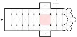 У залежності від характеру перетину виділяють два типи середохрестя. В першому нава і трансепт мають однакову висоту і підкупольний квадрат має чотири однакові арки. Другий тип середохрестя зі зниженим трансептом — може бути визначений за більш низкими, вузкими арками, що виразно розділяють наву, трансепт і хор.