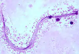 ![]() Мікрофілярія Mansonella ozzardi в мазку крові (забарвлення за Романовським-Гімзою) | ||||||||||||||