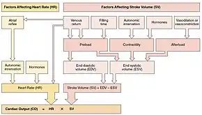 Серцевий викид є загальним показником кровотоку, що цікавить гемодинаміку, дослідження кровотоку. Чинники, які впливають на ударний об’єм і частоту серцевих скорочень, також позначаються на серцевому викиді. Малюнок на правому полі — докладна сходинкова ілюстрація, показує цю залежність і перелічує деякі з них.