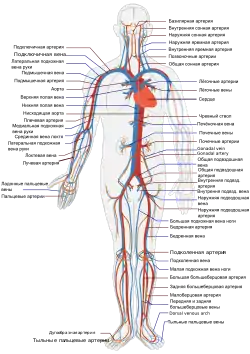 ![]() Схема будови серцево-судинної системи людини. Червоний колір позначає артеріальну кров, синій — венозну. | |