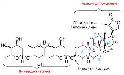 Складні органічні сполуки, що проявляють вибіркову дію на серце, виділяють у групу серцевих глікозидів. Кардіотонічну дію проявляє глікон, аглікон діє в 5-10 раз слабше[6].
