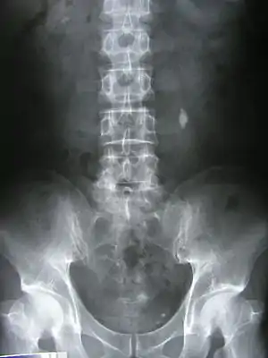 ![]() Рентгенограма, на якій видно камінь (конкремент) у лівому сечоводі Рентгенограма, на якій видно камінь (конкремент) у лівому сечоводі | |