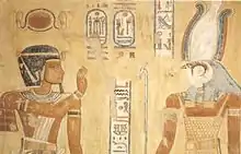 Рамсес III (зліва) в синій перуці ібес, увінчання діадемою сешед. Зображення з гробниці QV44