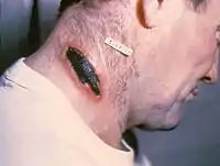 | Симптоми | виразка[1], нудота[1], діарея[1], кровотеча з прямої кишкиd[1], наявність крові у випорожненняхd[1], набряк, лімфаденіт і менінгеальні симптоми |