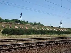 ![]() Напис «Слава героям Сиваша!» (укр. Слава героям Сивашу!) на станції Сиваш | |