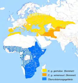 ![]() Ареал поширення євразійської сиворакші Ареал гніздування C. g. garrulus Ареал гніздування C. g. semenowi Ареал зимування | ||||||||||||||||