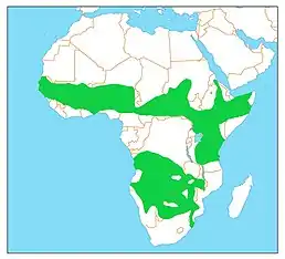 Вид поширений в Субсахарській Африці. Мешкає у сухих саванах з деревами або високими чагарниками.