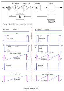 У схемі на вхід 1 модулятора надходить аналоговий сигнал і відразу порівнюється з вихідним сигналом 1-бітного ЦАП, який ідентичний квантованому сигналу на виході модулятора, тільки він двополярний. Різницевий сигнал — це помилка дворівневого квантування. В аналоговому інтеграторі накопичуються послідовні помилки квантування різної полярності, і їх середня величина флуктує відносно вхідного нуля компаратора. Тут йде мова про помилки дворівневого квантування, а це не помилки квантування модулятора.