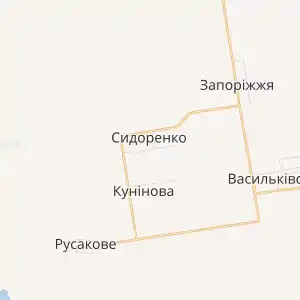 Село Сидоренко знаходиться на відстані 0,5 км від села Кунінова і за 1 км від села Запоріжжя. По селу протікає струмок що пересихає.