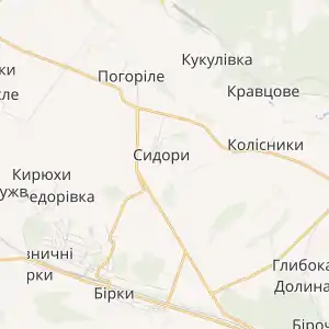 Село Сидори знаходиться на відстані 3 км від річки Мжа (правий берег), на відстані 2 км розташовані села Колісники, Погоріле, Бірки. Поруч проходить автомобільна дорога Т 2112. Навколо села багато садових ділянок.