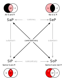 - O — від лат. nego— частковозаперечні («Деякі люди не є студентами»)