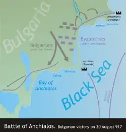 20 серпня 917 року на півночі від порту Анхіало (Помор'я) на ріці Ахелой[17] ромеї та болгари зустрілися в рішучому бою. Це безсумнівно була одна з найбільших битв Середньовіччя.[18] За відомостями літописців, які збереглися до наших днів, можна сказати, що болгари застосували традиційний для них маневр — наступ, неправильний відступ та рішучий контрнаступ (Маркели 792 р., Версинікія 813 р., Салоніки 996 р., Адріанополь 1205 р.). Коли візантійці захопились переслідуванням відступаючих болгар, втрачаючи суворий порядок та відкриваючи свій лівий фланг, Симеон кинув з північного заходу важку кінноту, а все болгарське військо перейшло у контрнаступ.[19] Кавалерійська атака на чолі з самим царем (кінь Симеона був убитий), була настільки стрімкою та несподіваною, що одразу знесла лівий фланг і вийшла у тил візантійців.[20][21] Відтиснуті до моря й атаковані з трьох сторін ромеї були цілком знищені.[22] Головнокомандувач Лев Фока ледь зумів втекти, а інші візантійські полководці загинули.[23] Битва була настільки кривавою, що, за словами літописця Симеона Логотета, «такої століттями не бувало». Лев Диякон, який відвідав місце бою за 75 років, відзначив: «І сьогодні можна бачити близько Ахелоя купи кісток ганебно побитого тоді ромейского війська, що відступало».[24] Болгарська армія кинулася у звичайне для неї рішуче стратегічне переслідування (після перемоги при Онглі 680 року болгари переслідували візантійців 150—200 км).