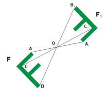 У планіметрії, для двовимірної фігури, центральна симетрія еквівалентна існуванню осі обертання другого порядку, тобто симетрії щодо повороту на 180°. У стереометрії, для тривимірної фігури, центральна симетрія є симетрією щодо складеної операції — повороту на 180° щодо довільної осі, яка проходить через центр симетрії, та дзеркального відбиття в площині, перпендикулярній цій осі.