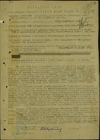 Указом Президії Верховної Ради СРСР від 22 липня 1944 року за вміле керівництво підрозділом, мужність і відвагу, проявлені під час захоплення і утримання плацдарму на березі річки Західна Двіна, лейтенанту Симону Василю Петровичу присвоєно звання Героя Радянського Союзу з врученням ордена Леніна і медалі «Золота Зірка».