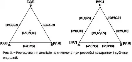 Як правило, поверхні відгуку в багатокомпонентних системах мають вельми складний характер. Для адекватного опису таких поверхонь використовують поліноми високих ступенів. У разі трикомпонентних систем найбільш часто застосовуються плани другого і третього порядку, з розробкою квадратних і кубічних моделей відповідно. Розташування дослідів на симплексі для цих моделей представлено на рис. 3.