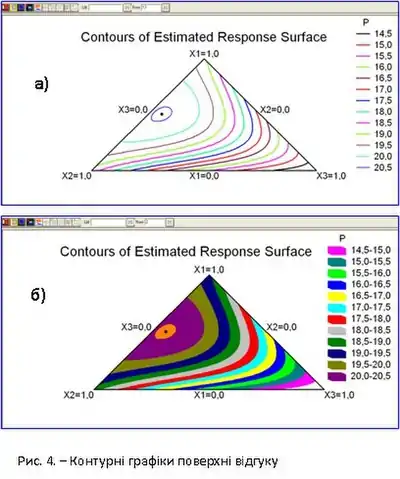 На рис. 4 а. представлений первісний контурний графік поверхні відгуку у вигляді контурних ліній рівних значень проекцій цільової функції Р на трикомпонентний симплекс. Разом з тим його можна одержати і як сукупність забарвлених зон, які відповідають певному інтервалу зміни цільової функції (див. рис. 4 б). Чорною крапкою на обох контурних графіках позначено оптимальне співвідношення варіюючих величин, що забезпечує максимальне значення функції відгуку.