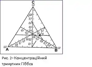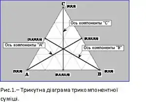 У разі трикомпонентної суміші кожній точці трикутної діаграми відповідає один, цілком певний склад, а кожному складу відповідає одна точка на діаграмі. У кожній вершині трикутної діаграми вміст одного компонента становить 100%. На протилежній цій вершині стороні вміст цього компонента дорівнює нулю. Сторони трикутника відповідають бінарним сумішам (див. рис.1).