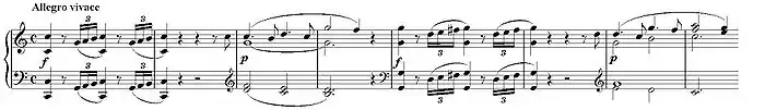 Перша частина написана у сонатній формі і містить три контрастні теми, що мають самостійне мелодійне значення: теми головної, побічної й заключної партій. Сама тема головної партії (що нерідко буває в Моцарта) містить у собі яскравий внутрішній контраст, вона складається із двох елементів:
