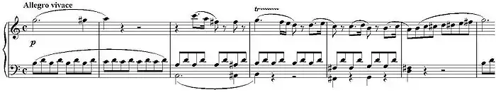 Ця ж тема лежить в основі сполучної партії, особливо її другий елемент, що одержує секвенційний розвиток. Побічна партія написана у домінантовій тональності (соль мажор) — вона легка і рухлива: