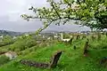 Вигляд з Єврейського цвинтаря. Над білою могилою проглядає синагога, ліворуч від могили — міська брама.