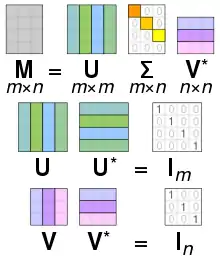- Σ — діагональна матриця розміру m×n з числами σ на діагоналі,