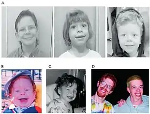 ![]() Двоє чоловіків, 21 і 28 років, з рисами обличчя, характерними для синдрому Вільямса Двоє чоловіків, 21 і 28 років, з рисами обличчя, характерними для синдрому Вільямса | |