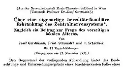 ![]() Перше сповіщення про хворобу у медичному часописі нім. Zeitschrift für die gesamte Neurologie und Psychiatrie в 1936 році. Перше сповіщення про хворобу у медичному часописі нім. Zeitschrift für die gesamte Neurologie und Psychiatrie в 1936 році. | |