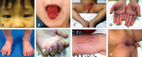 - Зміни на губах або в порожнині рота: «малиновий / полуничний» язик, еритема або тріщини на губах, ін'єктованість слизової порожнини рота і глотки