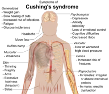 Синдром Кушинга — сукупність симптомів викликаних тривалим впливом глюкокортикоїдів, таких як кортизол. [3] [4] [5] Вперше синдром був описаний американським нейрохірургом Гарві Кушингом 1932 року. [6] Симптомами синдрому є: підвищений кров'яний тиск, черевне ожиріння (руки та ноги лишаються тонкими), кругле червоне обличчя, жирова грудочка між плечами, слабкість м'язів та кісток, вугрі та тендітна шкіра, яка погано загоюється. У жінок може розвиватися оволосіння за чоловічим типом і можуть спостерігатися нерегулярні менструації. Іноді синдром супроводжується змінами настрою, головними болями та хронічним відчуттям втоми. [7]