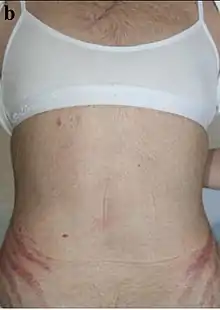 | Симптоми | Високий кров’яний тиск, абдомінальне ожиріння з тонкими руками та ногами, червонуваті розтяжки, округле червоне обличчя, жирова шишка між плечей, м’язова слабкість, вугрі, тендітна шкіра |
