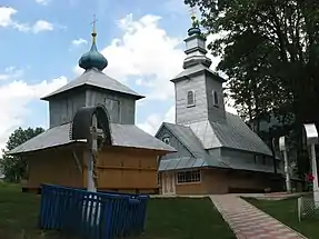 Біля церкви стоїть дерев’яна, двоярусна дзвіниця з опасанням і шатровим дахом, прикрашеним декоративним куполом. Дзвіницю відремонтував у 1847 р. майстер І. Мерцель. Дзвінниця разом з церквою входить до складу пам'ятки архітектури національного значення (№ 1126).