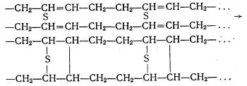 При процесі вулканізації з каучуку, сірки і наповнювача (переважно сажі) виготовляють суміш, якою наповнюють відповідні форми і під тиском нагрівають. При 130—160°С каучук взаємодіє з сіркою і молекули його зв'язуються між собою атомами сірки. Частково вони зв'язуються між собою і безпосередньо. Зв'язок між ними здійснюється за рахунок вільних валентностей, які виникають при розриві подвійних зв'язків. Процес вулканізації бутадієнового каучуку схематично можна представити такими рівняннями: