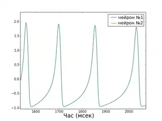 - експоненційна модель «інтегрувати і спрацювати» (AdEx)[34]. Є найпростішою моделлю що здатна продукувати всі основні динамічні режими біологічного нейрону, такі як одноразове спрацьовування, регулярне спрацьовування у відповідь на стимуляцію постійним струмом, пачкова активність тощо. Широко використовується у дослідженнях синхронізації у великих гетерогенних популяціях нейронів. Описується системою з двох диференційних рівнянь.