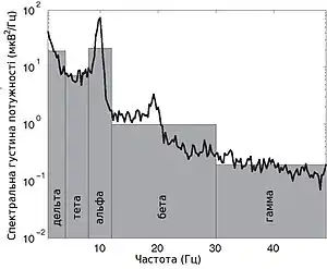 У більшості випадків, сильна глобальна синхронізація великих популяцій (синхронізація типу I) притаманна стану бездіяльності або стану патологічному, адже динаміка повністю синхронізованої мережі не достатньо складна для ефективної обробки інформації. Під час нормальної ж роботи (окрім стану глибокого сну), невеликі локально-синхронізовані підмережі генерують коливання різних частот (синхронізація типу II), при цьому глобальна синхронізація зникає[4]. Таким чином, спектр ЕЕГ сигналу містить декілька важливих складових, які прийнято класифікувати за частотою, призначаючи кожному діапазонові грецьку літеру. У таблиці нижче наведено короткий опис кожного з ритмів, відповідно до традиційної системи класифікації, а також їх відповідні функції.