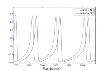 - Модель Годжкіна-Гакслі (HH) та похідні — сімейство детальних біологічно-реалістичних моделей нейронів, що включають у себе кінетику натрієвих, калієвих, кальцієвих та інших іонних каналів. Різні модифікації здатні дуже точно імітувати форму потенціалу дії справжніх нейронів. Система зазвичай описується щонайменш чотирма нелінійними диференційними рівняннями. Не зважаючи на складність математичного визначення, HH-подібні моделі успішно використовуються для досліджень ефектів синхронізації у великих популяціях нейронів[36].