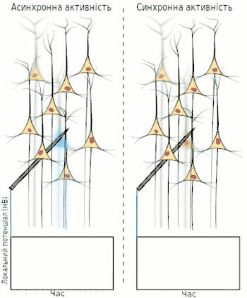 - локальна синхронізація (синхронізація активності окремої популяції нейронів що призводить до утворення макроколивань і може стає помітною в сигналі ЕЕГ)