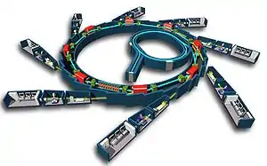 Після того, як користь синхротронного випромінювання стала зрозумілою, почали будуватися пристрої, призначені для його створення, так звані «фабрики фотонів». Такі спеціалізовані синхротрони отримали назву накопичувальні кільця[17]. Вони побудовані таким чином, щоб зберігати у собі пучок електронів довгий час. Для цього у них підтримується вакуум високого ступеню і використовуються спеціальні (квадрупольні і секступольні) магніти, що не дозволяють пучку розширюватися.