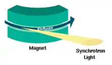 Синхротронне випромінювання — частковий випадок магнітогальмівного випромінювання. Магнітогальмівне випромінювання нерелятивістських заряджених частинок називають циклотронним. Особливістю синхротронного випромінювання є те, що воно, переважно, розповсюджується в напрямку руху електрона, тобто, по дотичній до траєкторії його руху («прожекторний ефект»), тоді як циклотронне випромінення розповсюджується по всій площині, перпендикулярній до траєкторії руху. Через ефект Доплера, його частота є значно вищою ніж у циклотронного (іншим аспектом зміщення є те, що лінії високих гармонік спектру знаходяться дуже близько, тому він майже неперервний, на відміну від циклотронного)[1]. Також, синхротронне випромінювання сильно поляризоване.