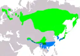Сучасний ареал охоплює смугу тайгових лісів від Естонії та Фінляндії в Європі, Сибіру і на південь до Гімалаїв, північно-західній Індії і Західного Китаю.