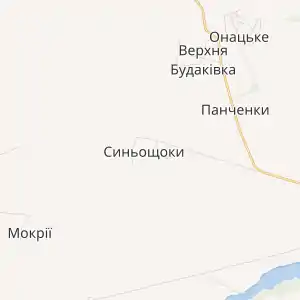 Село Синьощоки знаходиться на відстані до 2-х км від сіл Верхня Будаківка, Панченки та Мокріївка. По селу протікає пересихаючий струмок з загатою.