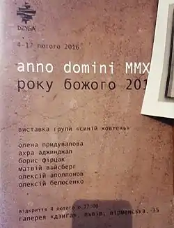 ![]() Афіша виставки в рамках проєкту "Anno Domini-2015", Львів, 2016 Афіша виставки в рамках проєкту "Anno Domini-2015", Львів, 2016 | |