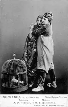 Право першої постановки драматург надав Московському художньому театру. 30 вересня 1908 року відбулася прем'єра «Синього птаха» у постановці одного з засновників театру Костянтина Сергійовича Станіславського (режисери – Леопольд Сулержицький та Іван Москвін, композитор – Ілля Сац, художник-декоратор – Володимир Єгоров). У прем'єрній виставі грали такі видатні актори, як Ольга Кніппер-Чехова, Аліса Коонен, Іван Москвін. «Синій птах» став одним із найбільш репертуарних спектаклів легендарного московського театру (за 50 років п'єса була зіграна дві тисячі разів).