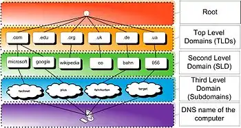 Як вже було відмічено, існує домен кореневого рівня, який позначається крапкою .. Наступний рівень ієрархії — це домени верхнього рівня. Вся структура служби DNS є ієрархічною.