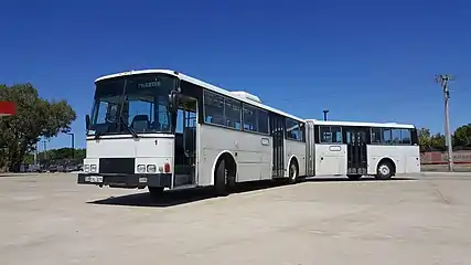 Поворот зчленованого автобуса зміщенням передніх і задніх коліс з одночасним пасивним поворотом ланок на шворні